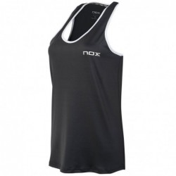 Camiseta de padel para mujerde tirantes y corte entallado. En plomo con detalles en blanco. Poliaster 90% y Elastano 10%. Tejido ligero y elastico con tecnologia Balance Fresh de NOX para un maximo confort en el juego.